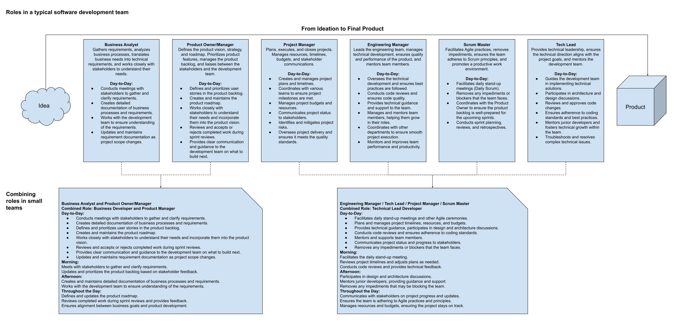 In smaller teams, it is often necessary to combine roles to ensure efficiency and make the best use of limited resources. For instance, a single individual might take on the responsibilities of an Engineering Manager, Tech Lead, Project Manager, and Scrum Master. Similarly, another person might fulfill the duties of both a Business Analyst and a Product Owner/Manager.